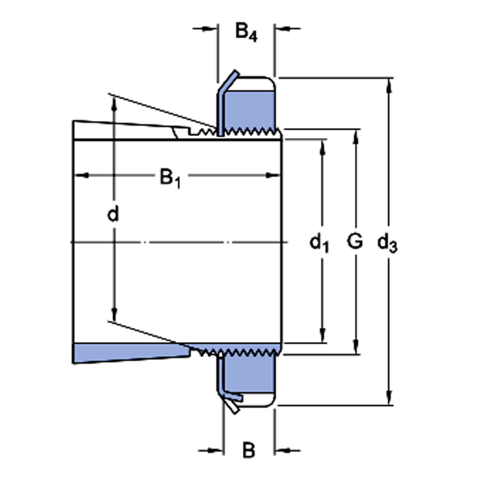 G M 35X1.5 d1 30 mm d3 52 mm B1 43 mm B 8 mm B4 9 mm 0.16 kg 配件: 螺母+锁定装置用于锁定到轴上 KM07 锁紧垫片 MB07