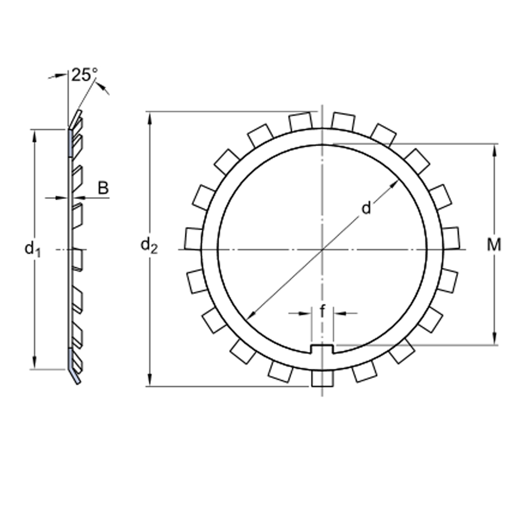 d 25 mm d1 32 mm M 23 mm d2 42 mm B 1.25 mm f 5 mm mm kg